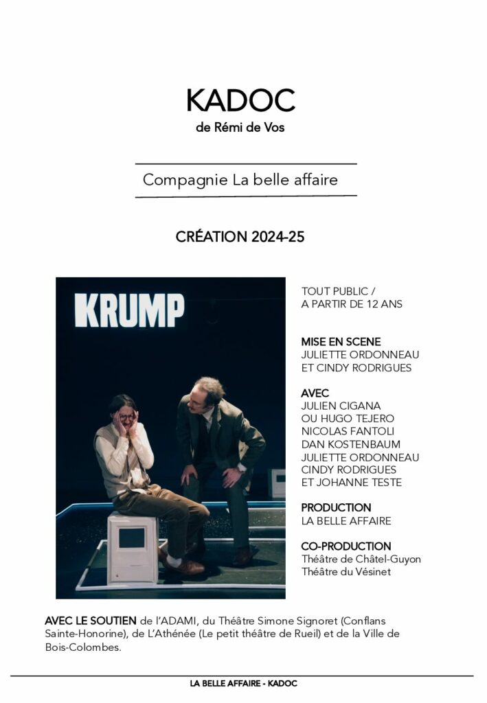 « KADOC », farce sociale aux allures de vaudeville, nous montre comment les névroses, les frustrations et les luttes de pouvoir au sein de l’entreprise commerciale KRUMP dérèglent le quotidien de trois couples, trois hommes salariés à des postes hiérarchiques différents et leurs épouses, pour les mener jusqu’à la folie collective.