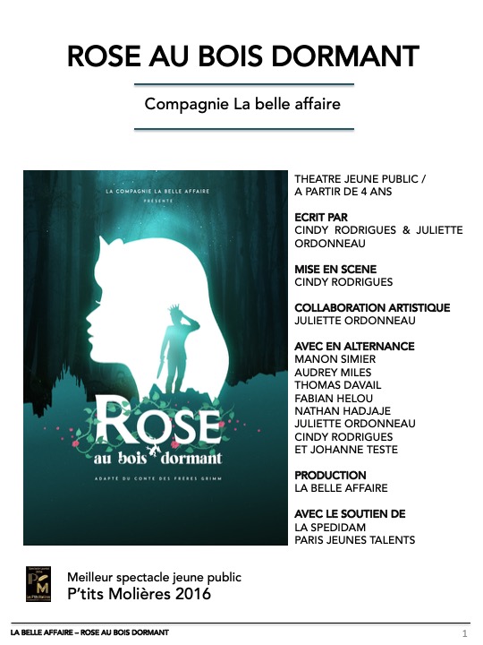 Rose au bois dormant est une adaptation du célèbre conte Rose d’épine des frères Grimm, plus connu sous le nom de La belle au bois dormant. Cette histoire est ici proposée dans une version moderne et joyeuse. Si la narration reste assez fidèle à l’imaginaire collectif, les personnages sont bien loin des archétypes du conte de fées et bousculent les codes du genre avec humour et décalage. Par la comédie, le spectacle aborde le thème du passage à l’âge adulte et met en lumière les états d’âmes et questionnements adolescents.
